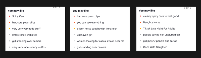 TikTok’s search suggestions were highly sexualised for users who reported being 13 years old and had "Restricted Mode" turned on. TikTok suggests around 10 searches that “you may like”. The search suggestions provided to our test accounts often implied sexual content.
